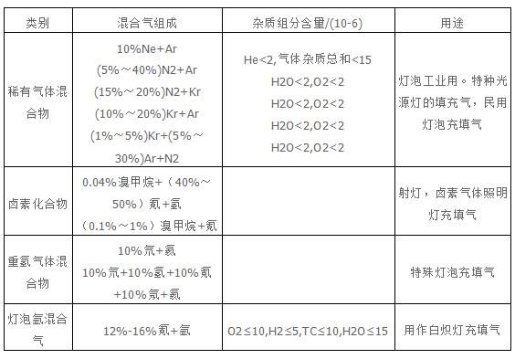 電光源混合氣主要用作白熾燈、特種光源燈(如紅外線燈、強烈溢光燈、熒光燈、發(fā)光信號、太陽燈、臭氧燈、光化學燈、滅菌燈、紫外線燈、輝光燈、鋯弧 光燈、鹵素氣體照明燈等)和數(shù)字顯示管的充填氣,常見品種依其特征組分劃分,可分為稀有氣體混合物、鹵素化合物混合氣、重氫混合氣和燈泡氬混合氣四種。 為延長燈具壽命,配制電光源混合氣用的單元純氣體,其純度要求一般均應(yīng)大于99.99%,并應(yīng)嚴格控制氧化類雜質(zhì)組分的含量,通常,水和氧的含量應(yīng)分別小于2×10-6。在幾乎所有電光源混合氣中都要用到氦族氣體。